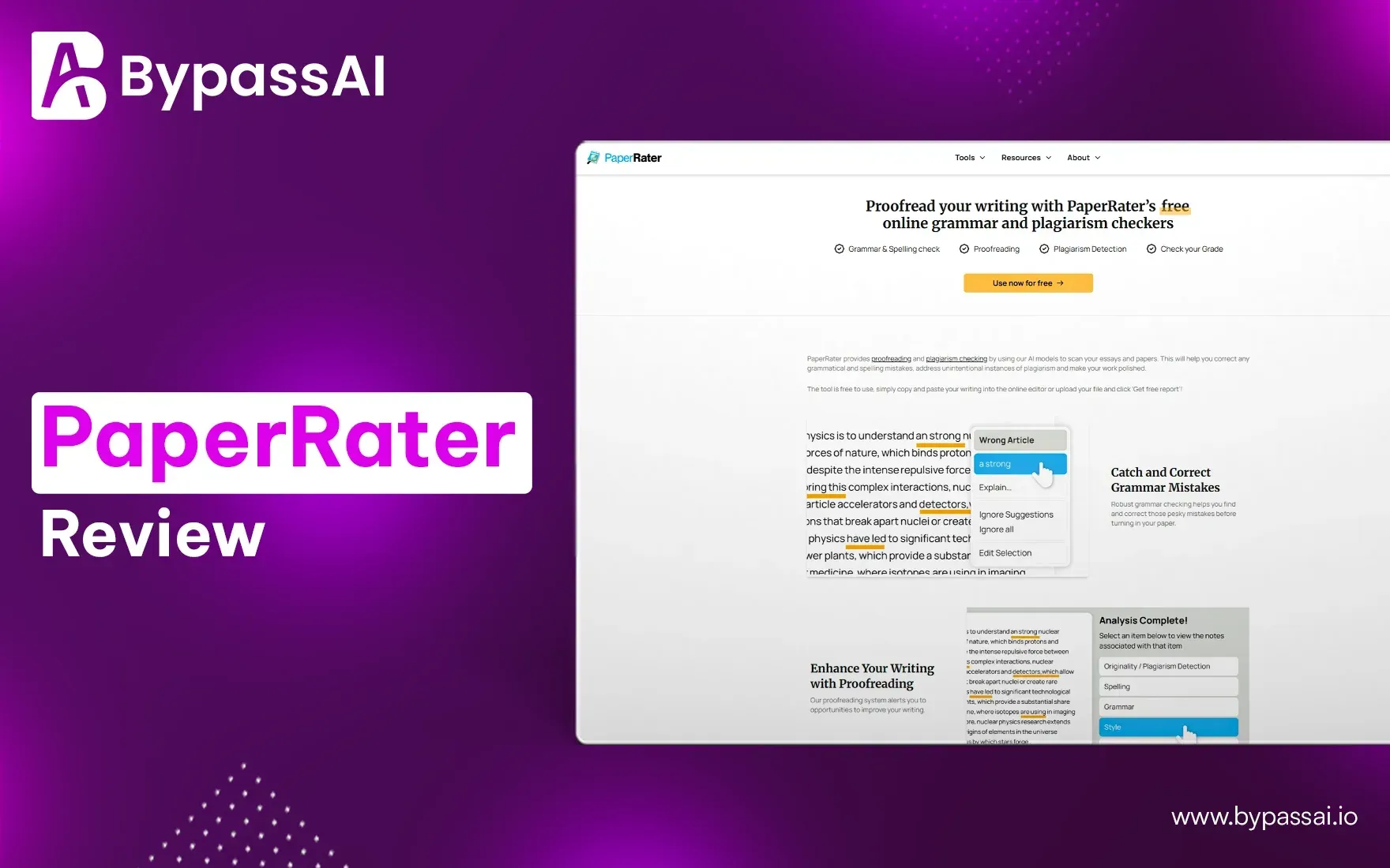 PaperRater is an excellent resource for general proofreading and validating the originality of your content, especially for school teachers and students who require fast, free-of-charge services without signing up. Nonetheless, it has some downsides, and the most notable is the advertising loaded UI as well as sporadic crushes. If you want to get access to more advanced tools or industry-level accuracy, there are always alternatives to think about: Bypassai, Grammarly, Quillbot, or Copyleaks.
