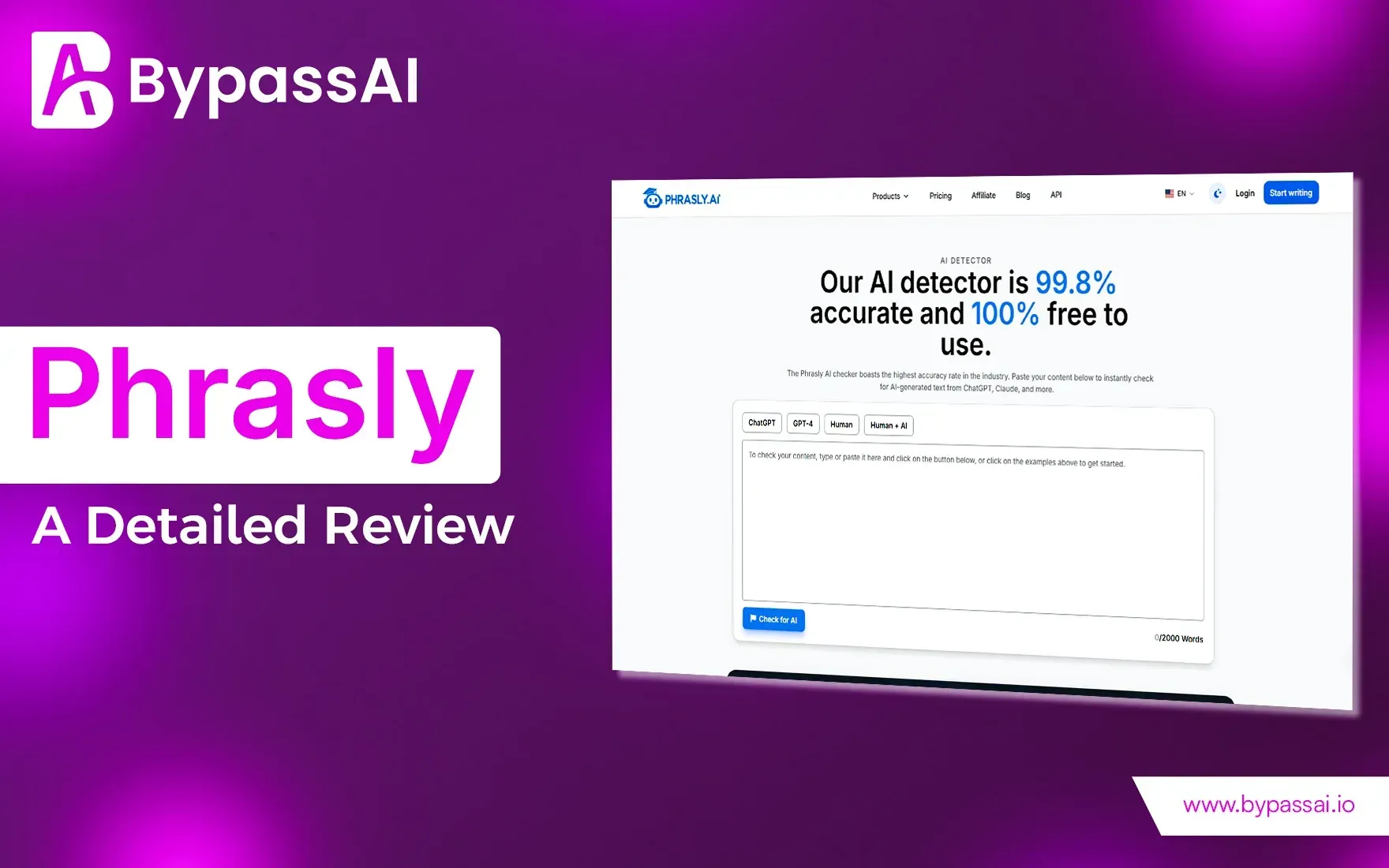 Phrasly AI works very well at catching standard AI-generated content. Its algorithm is best suited at noticing basic AI language patterns which makes it a great addition to any quick content scan. However, its value is not as high while detecting highly sophisticated AI models that can produce content just about indistinguishable from human writing. In such cases, the AI may fail to identify correctly. For this reason, some users have resulted in looking for other detecting tools, including BypassAI IO, which offers higher accuracy and precision concerning complex content. In that case, while Phrasly AI is reliable, it is best used with other detection tools for the best outcome.
