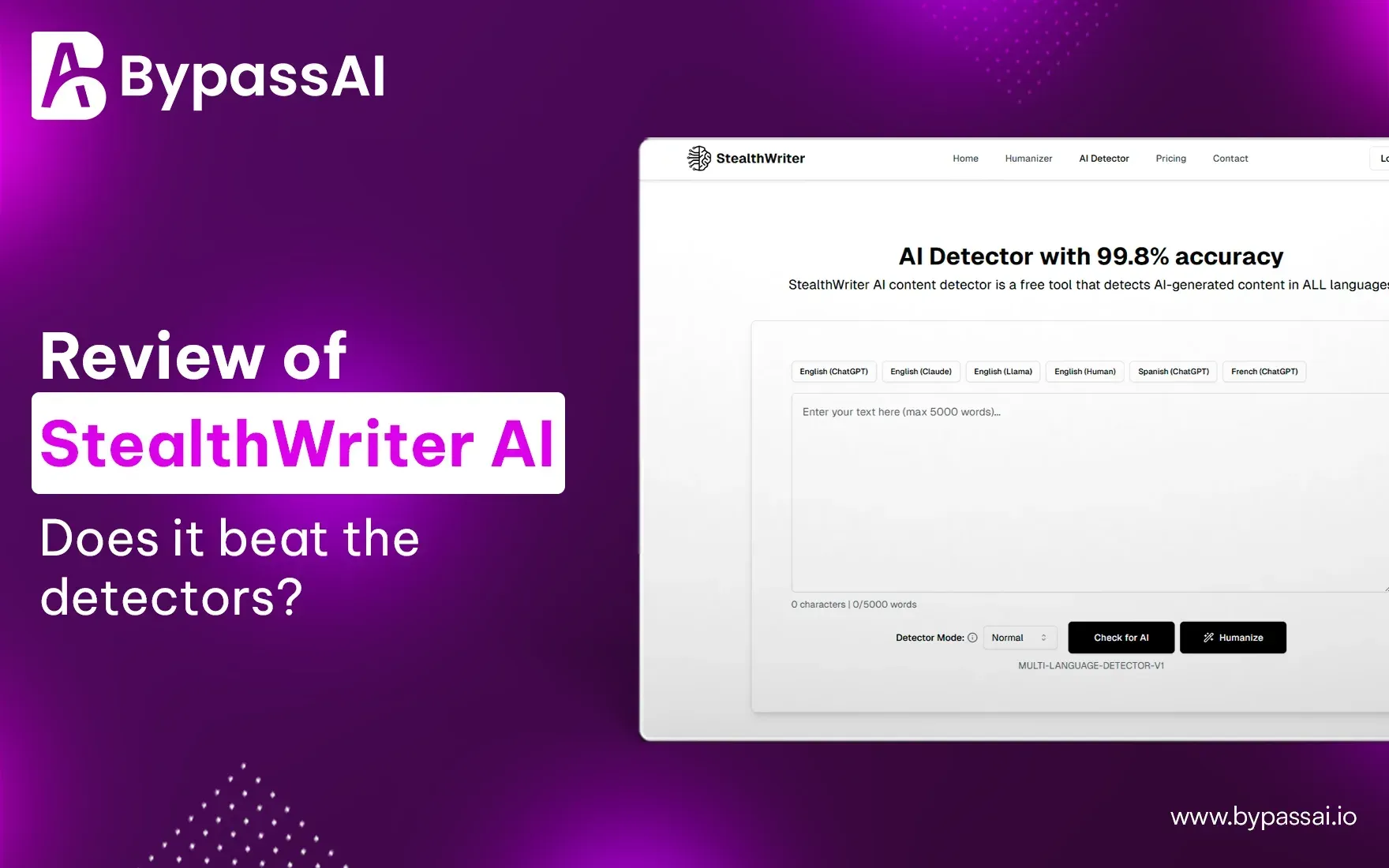 The StealthWriter AI platform markets itself as the best undetectable platform, but according to our tests, it frequently bypasses simple or short content, it cannot accurately bypass critical and lengthy content.